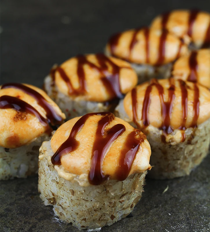 Рис для суши, нори, творожный сыр, огурцы, сырная шапка, угорь, стружка тунца. Подается в соусе унаги.