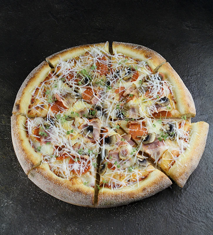 Моцарелла, пепперони, бекон, шампиньоны, пармезан, микрозелень, фирменный томатный соус